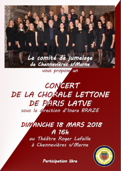Matinée libre en famille, certains allant faire leur jogging d'autre visitant le marché de La Varenne pendant que notre présidente allait chercher au RER les choristes de « Paris Latve » qui donnaient à 16h un concert gratuit à l'initiative de l'association. La salle était relativement pleine pour cette superbe prestation, tout le monde a pu admirer les costumes typiques et la beauté des voix, y compris quand nos hôtes sont montés sur scène pour un chanson. Celui-ci fut suivi d'un vin d'honneur offert par la municipalité et d'un repas froid offert par le comité. Là encore, quelques chants avant de terminer le repas, puis ce fut un ballade nocturne dans Paris pour apprécier quelques monuments et voir de près scintiller la Tour Eiffel.